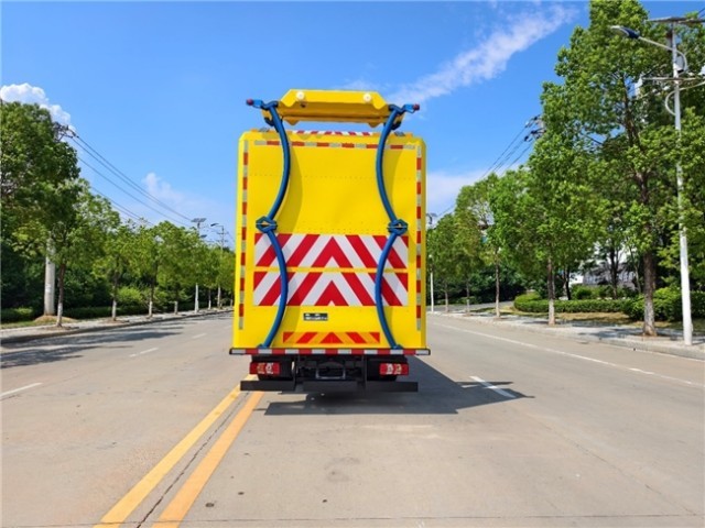 车辆核心的防撞缓冲模块采用国际知名品牌“畅行达”100K防撞缓冲垫,配合导向标志架组成集成式安全防护系统。该模块最大防撞缓冲等级为2000kg—100Km/h,如发生追尾碰撞,能有效吸收冲击能量,在肇事车辆与作业区之间形成缓冲区域,大幅降低人员受伤和设备损毁的风险。其配备的LED矩阵爆闪灯支持多种警示模式,可单独指示左、右方向或禁止通行,显著提升警示效果。模块还配备高性能液压系统,实现快速举升与降落,操作便捷且稳定可靠。