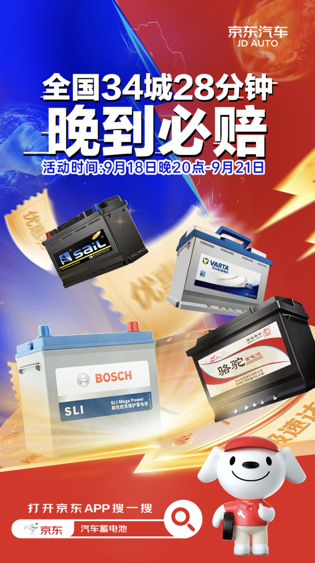 28分钟晚必赔升级!京东汽车919蓄电池节极速达覆盖34城