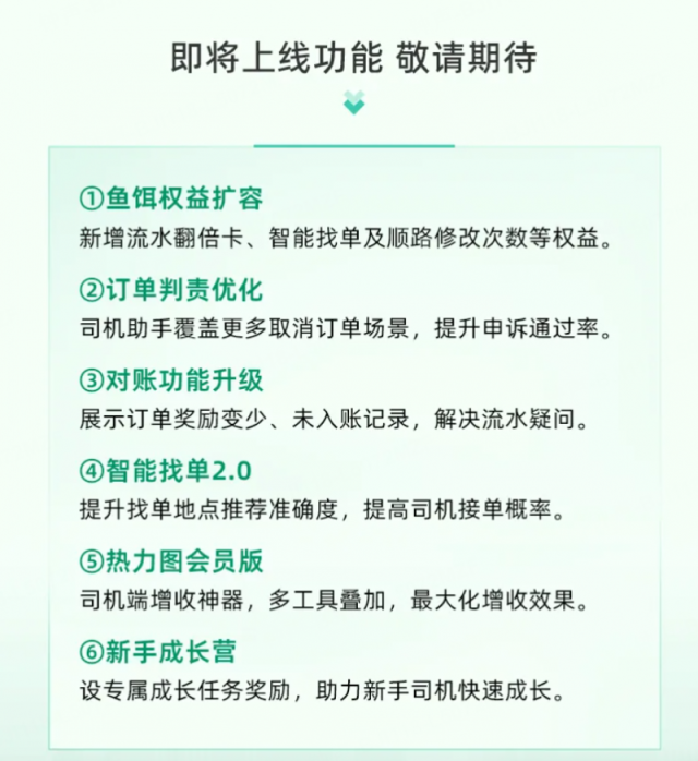 平台还预告了一系列即将上线的新功能,例如“集鱼饵”权益将新增流水翻倍卡、智能找单2.0、热力图会员版、新手成长营等,助力司机实现效益最大化,帮助新手司机适应跑单节奏,提升接单能力。