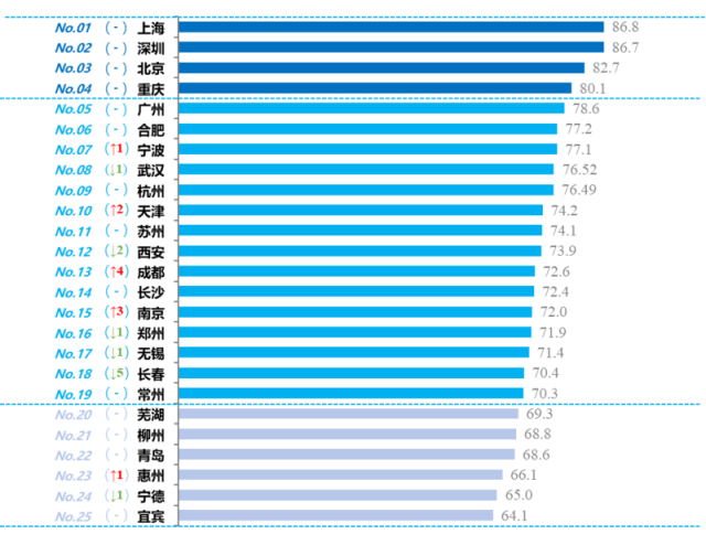 从总指数看,25座城市继续分为三个梯队,但第一、二梯队城市数量扩容。第一梯队城市评估分值大于80分,综合竞争优势明显,由3座城市扩容至4座城市,其中上海、深圳、北京继续保持前三位,重庆分值突破80分,进入领跑方阵。第二梯队城市评估分值在70-80分之间,具有独特比较优势,由13座城市扩容至15座城市,分别是广州、合肥、宁波、武汉、杭州、天津、苏州、西安、成都、长沙、南京、郑州、无锡、长春、常州。第三梯队城市评估分值在60-70分之间,在细分领域各有特色长板或较大发展潜力,主要有6座城市,分别是芜湖、柳州、青岛、惠州、宁德、宜宾。