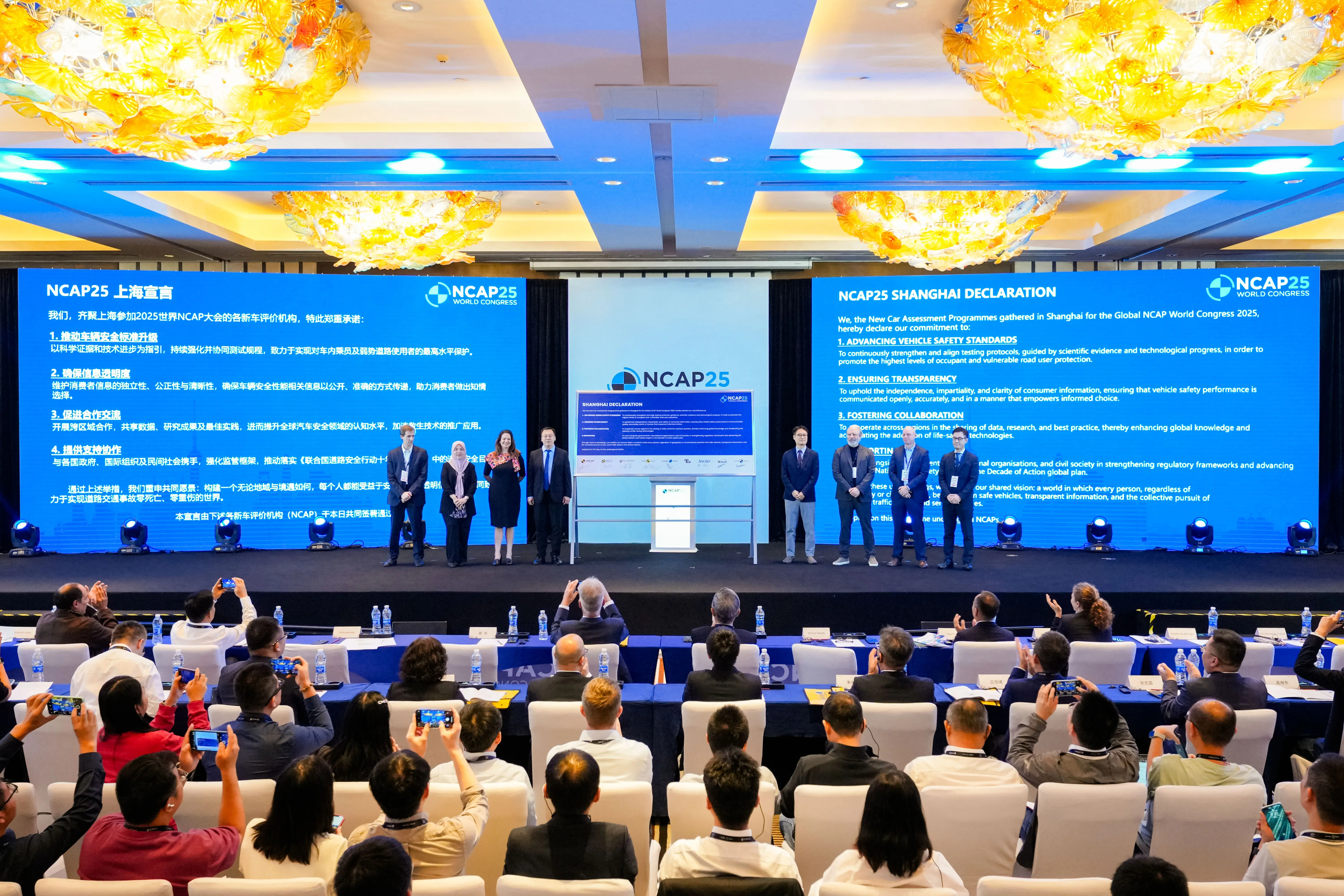 会上,全球新车评价规程(Global NCAP)、澳大利亚新车评价规程(ANCAP)、欧洲新车评价规程(Euro NCAP)、中国新车评价规程(C-NCAP)、东盟新车评价规程(ASEAN NCAP)、韩国新车评价规程(KNCAP)、日本新车评价规程(JNCAP)、拉丁新车评价规程(Latin NCAP)等国际主流NCAP机构现场联合发布“NCAP25上海宣言”。宣言凝聚各国安全治理共识,推动新兴市场 NCAP 体系与成熟标准衔接,形成全球统一的安全升级合力。