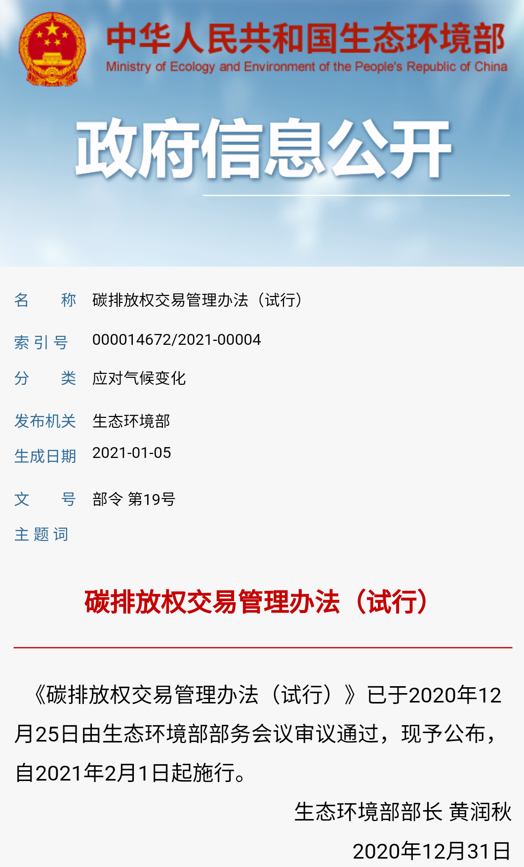 1月5日,生态环境部正式公布了《碳排放权交易管理办法(试行)》(以下简称《办法》),明确全国碳排放权交易市场的交易产品为碳排放配额,温室气体重点排放单位以及符合国家有关交易规则的机构和个人,是全国碳排放权交易市场的交易主体,自2021年2月1日起施行。