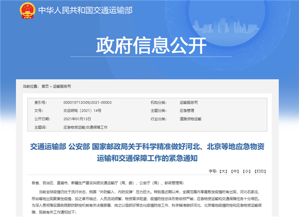 对此,1月13日,交通运输部、公安部、国家邮政局印发《关于科学精准做好河北、北京等地应急物资运输和交通保障工作的紧急通知》(以下简称《紧急通知》)。“其中对破解当前交通运输及快递服务的一些现实矛盾提出了具体措施,提供了权威依据,具有很强的针对性。”中国公路学会专家委员会委员陈世平向《中国汽车报》记者表示,当前部分地区疫情防控形势严峻,畅通交通运输“大动脉”的意义尤为重要。