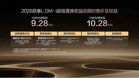10月23日,2026款秦L DM-i正式上市,共2款车型,包括128KM进取型和128KM领先型,官方指导价9.68-10.68万元。2025年11月30日24:00前完成购车开票可享限时无门槛超级置换补贴4000元,补贴后售价9.28-10.28万元。 此次上新2026款,拥有128km纯电续航,2.79L超低油耗,新增未央灰车色和怀挡,同时搭载功能丰富的辅助驾驶和智能座舱,以更省、更远、更智能的核心优势,再次刷新中级轿车新标杆。