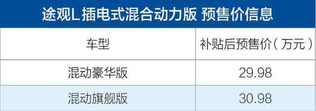 近日,大众公布了途观LPHEV的预售价,新车将推出2款车型,补贴后的预售价为29.98-30.98万元,新车将于10月19日正式上市。途观LPHEV在外观方面与途观L基本一致,造型硬朗有力。它预计搭载一套由1.4T涡轮增压发动机和一台电动机组成的插电混动系统,纯电续航里程可以达到52km。