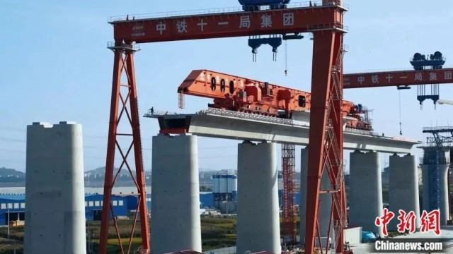 40米预制箱梁在架设过程中采用千吨级运架一体机——“昆仑号”,是目前我国功能最全的高铁桥梁提运架设备,不仅能满足 24 米、32 米、40 米不同跨度的高铁箱梁施工作业,还可提升25%的架梁速度,填补了高铁建设领域的多项空白,实现了我国高铁建设技术水平的提升。图为“昆仑号”在福厦高铁施工建设中投用。中国铁路南昌局集团 供图