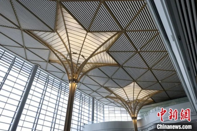 福厦高铁福州南站以“榕荫聚福、丝路方舟”的设计理念,以“古厝叠浪”为主要元素,融合传统与现代,兼具实用与美感,既凸显了空间的开阔大气,又表达了“榕城”的城市文脉。图为8月19日,福厦高铁福州南站的榕树型站内空间结构。李响 摄