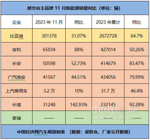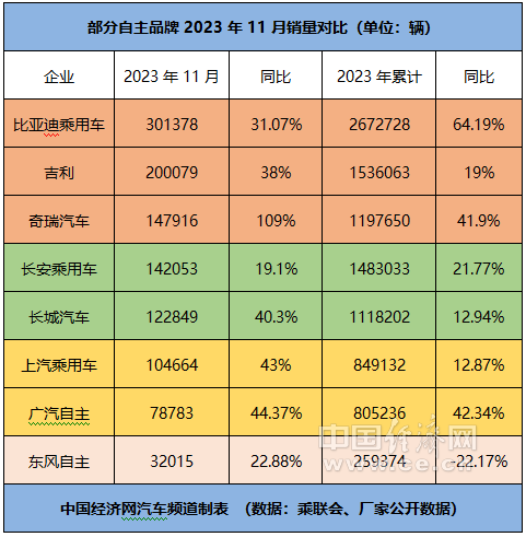 中国经济网记者通过梳理厂家公开的数据和乘联会发布的数据发现,11月,比亚迪乘用车、吉利、奇瑞、长安乘用车、长城、上汽乘用车、广汽自主和东风自主(含东风柳汽、东风乘用车和岚图汽车)的销量分别为301378辆、200079辆、147916辆、142053辆、122849辆、104664辆、78783辆、32015辆,同比分别增长31.07%、38%、109%、19.1%、40.3%、43%、44.37%、22.88%;今年前11个月的累计销量分别为2672728辆、1536063辆、1197650辆、1483033辆、1118202辆、849132辆、805236辆、259374辆,同比分别增长64.19%、19%、41.9%、21.77%、12.94%、12.87%、42.34%、-22.17%。
