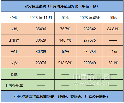 作为新崛起的自主出海“四强”,长城、比亚迪、吉利、长安在11月的海外销量分别为35496辆、30629辆、30209辆、23976辆,同比分别增长76.7%、148.7%、62%、518.58%;前11个月的累计销量分别为282542辆、277675辆、252754辆、220849辆。