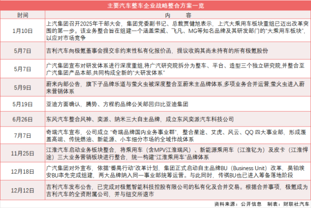据财联社记者初步统计,2025年,上汽集团、东风集团、广汽集团及奇瑞、吉利等国内多家主流车企不约而同地选择了“刀口向内”做减法的内部整合,为占领未来市场制高点积蓄力量。