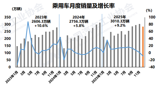 作为汽车市场的绝对主力,乘用车市场2025年迎来大爆发,产销分别完成3027万辆和3010.3万辆,同比分别增长10.2%和9.2%,“这也是我国乘用车产销首次突破3000万辆。”陈士华说。