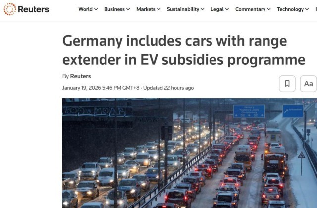 【环球网科技综合报道】1月20日消息,据路透社报道称,德国环境部日前宣布,将配备增程器的电动汽车纳入国家新能源汽车补贴计划,旨在降低中小收入家庭购车门槛,并刺激国内低迷的汽车消费。