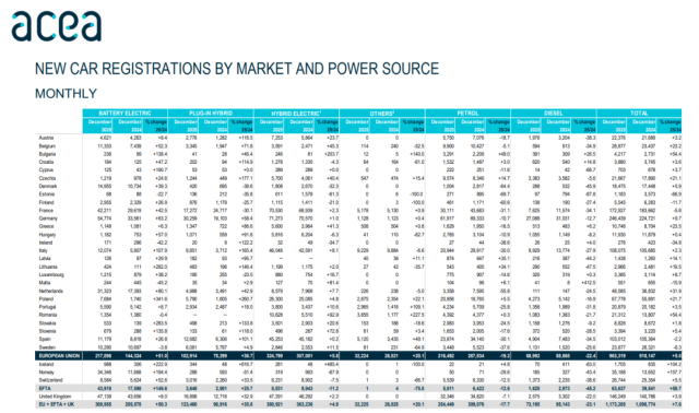 以最新的12月数据为例,欧盟乘用车总销量为963319辆,同比增长5.3%。其中,油电混合动力车、纯电动车、插电式混合动力车销量分别为324799辆、217898辆、102914辆,分别同比增长5.8%、51%、36.7%,合计占欧盟总销量的67%,高于2024年12月的57.8%。如果只看纯电动车+插混车,则该月欧盟电动汽车市占率为33.3%。