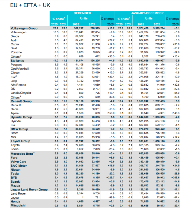 从体量来看,2025年在欧洲市场排名前四的玩家依然是:大众集团、Stellantis、雷诺集团、现代汽车集团,而宝马集团取代丰田位列第五。