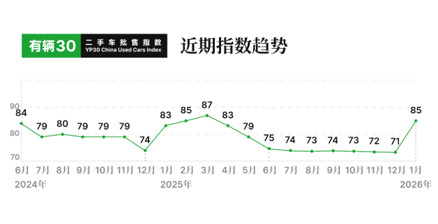 2月6日,有辆科技发布“有辆30二手车批售指数”2026年1月最新数据,录得指数为85点。受春节前汽车消费市场强劲需求驱动,该指数环比大幅上涨19.7%,创下自发布以来单月最大的涨幅纪录。与此同时,本次“有辆30指数”首次完整公开了构成该指数的全部30款基准车型清单,这不仅标志着指数的透明度与市场参考价值迈上新台阶,也为观察中国二手车市场的真实动态提供了更为清晰、可信的量化框架。