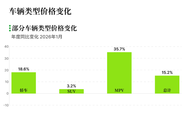 从车辆类型看,市场热点发生明显切换。MPV车型价格同比暴涨35.7%,成为增长最快的品类,反映了家庭出行与休闲场景需求的爆发。传统热门品类SUV同比微增3.2%,轿车增长18.6%。