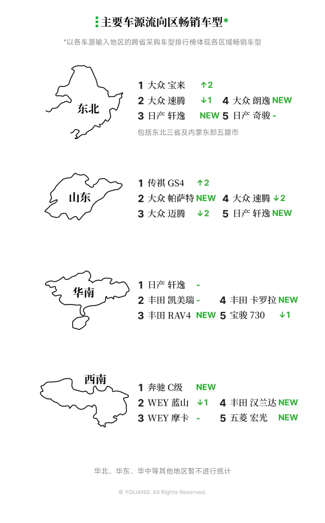从流通方面看,中国二手车车源的流通性持续增加,2026年中国全年二手车交易量首次突破2000万台大关,达到2010.80万辆,同比增长2.52%,跨省流通比例持续增加。有辆30指数创新型的提供“跨省流通”分析,在省级行政区跨省采购榜单中,2026年1月四川省跻身TOP 5榜单。在跨省流通畅销车型方面,日系品牌表现出了传统优势,出现在各省TOP 5采购榜单的车型8次位居第一,德系品牌车型7次位居第二。